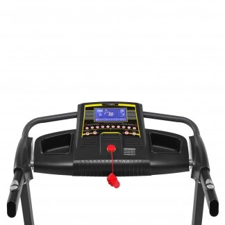 Электрическая беговая дорожка для домашних тренировок. Высокопрочная рама и устойчивый к механическим воздействиям пластик корпуса обеспечивают безопасность занятий. Надежный двигатель мощностью 2.0 л.с. постоянного тока выдерживает пользователя весом до 120 кг. Двухслойное беговое полотно 120х42 см достаточно комфортно для бега на высоких скоростях людям с ростом вплоть до 2-ух метров. Система амортизации на основе 6 эластомеров снижает нагрузку на позвоночник и суставы. Беговое полотно имеет 2 положения наклона и регулируется вручную. Большой LCD монитор отображает основные параметры во время тренировки. В программный пакет входят 12 предустановленных программ. Контактные датчики на рукоятках выводят показания пульса на экран. Беговая дорожка оснащена гидравлической системой складывания, способствующей легкому и безопасному подъему и опусканию бегового полотна.